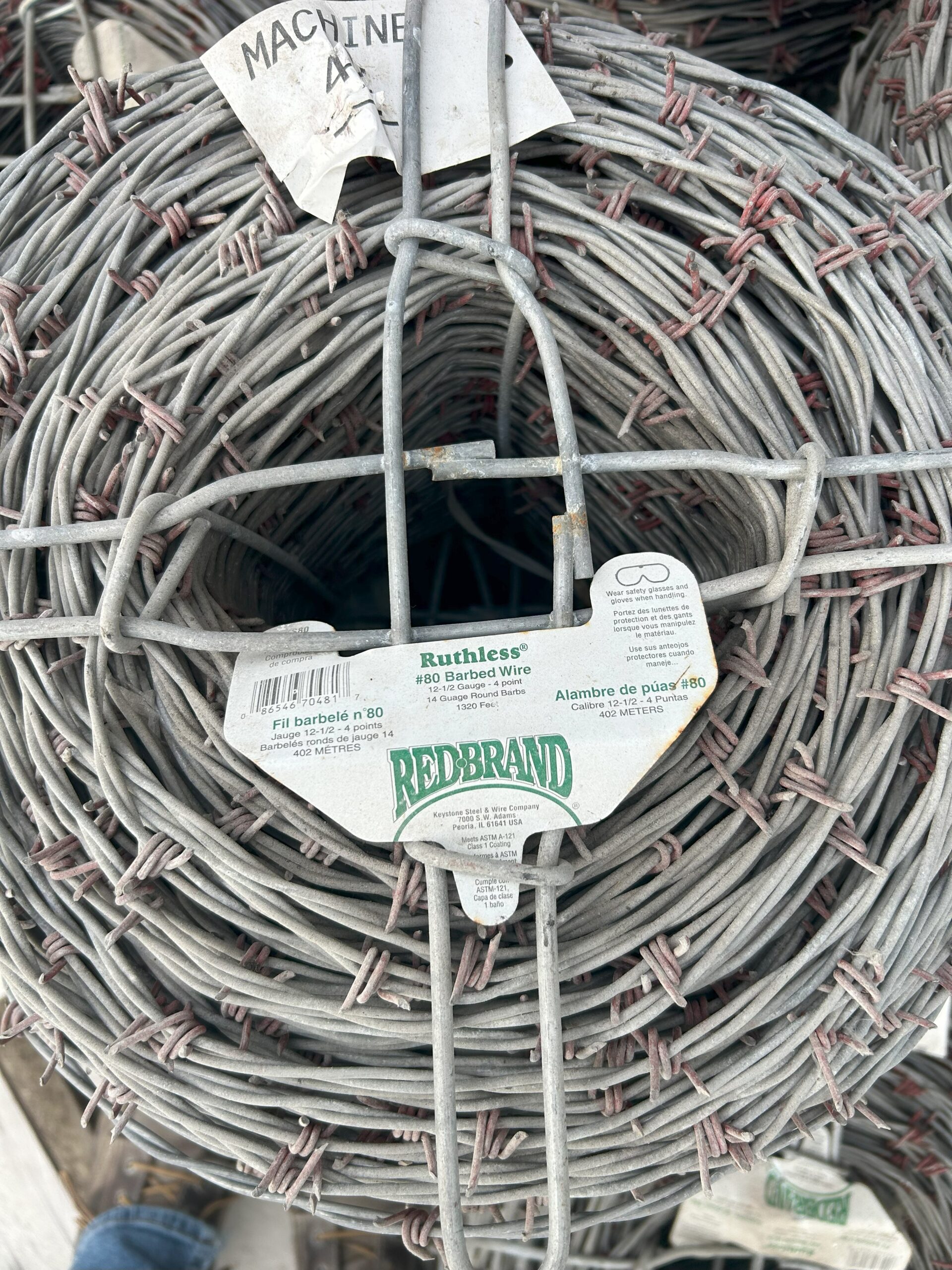 We have Oklahoma Steel barb wire in stock, we carry 2 types, Hi tensile and the heavier gauge Ruthless. They come in 1320ft rolls