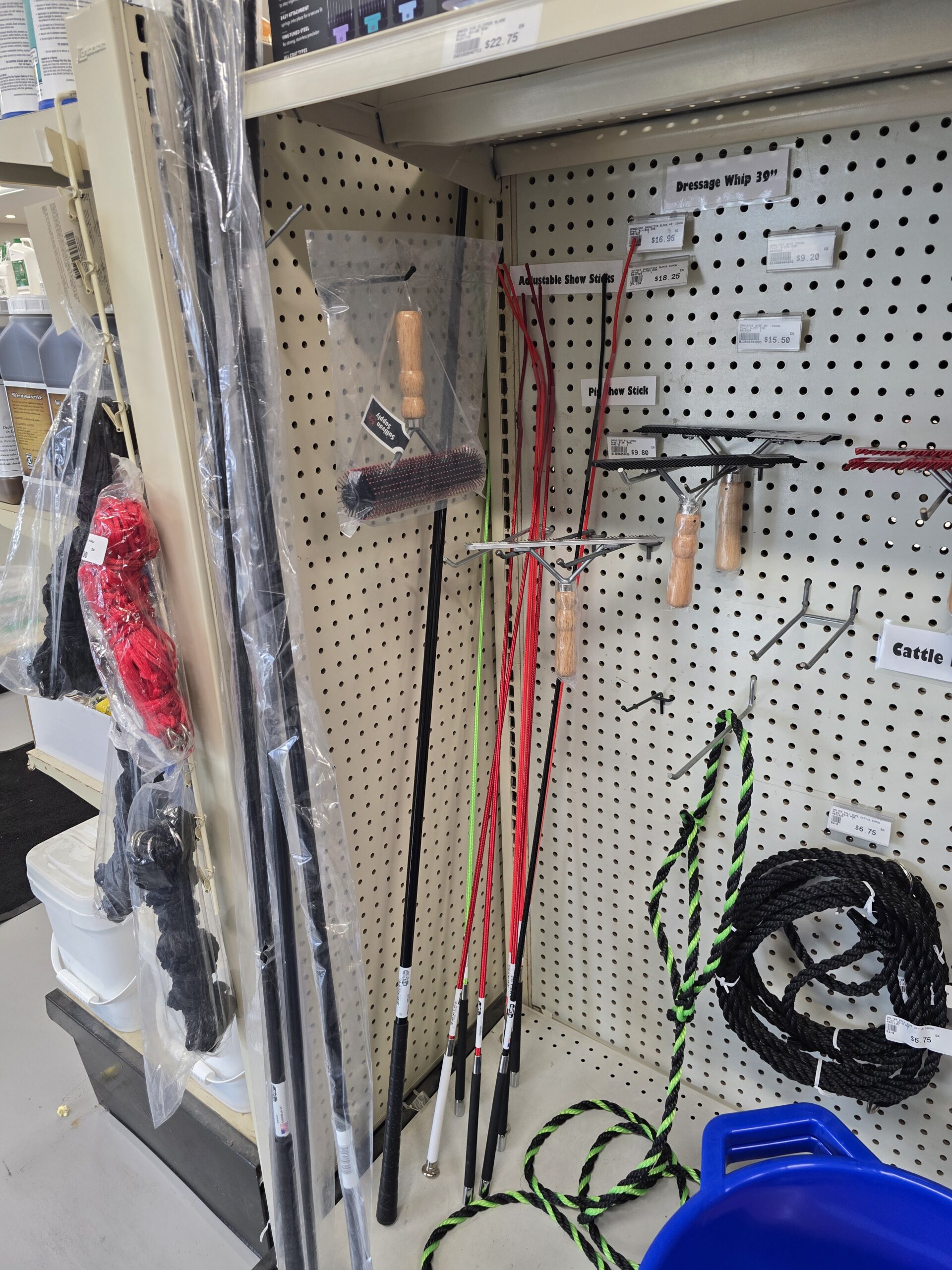We carry a selection of rope and leather show and barn halters for cattle, sheep, and goats. We also offer adjustable and fixed length show sticks, as well as hog whips, and brushes.
