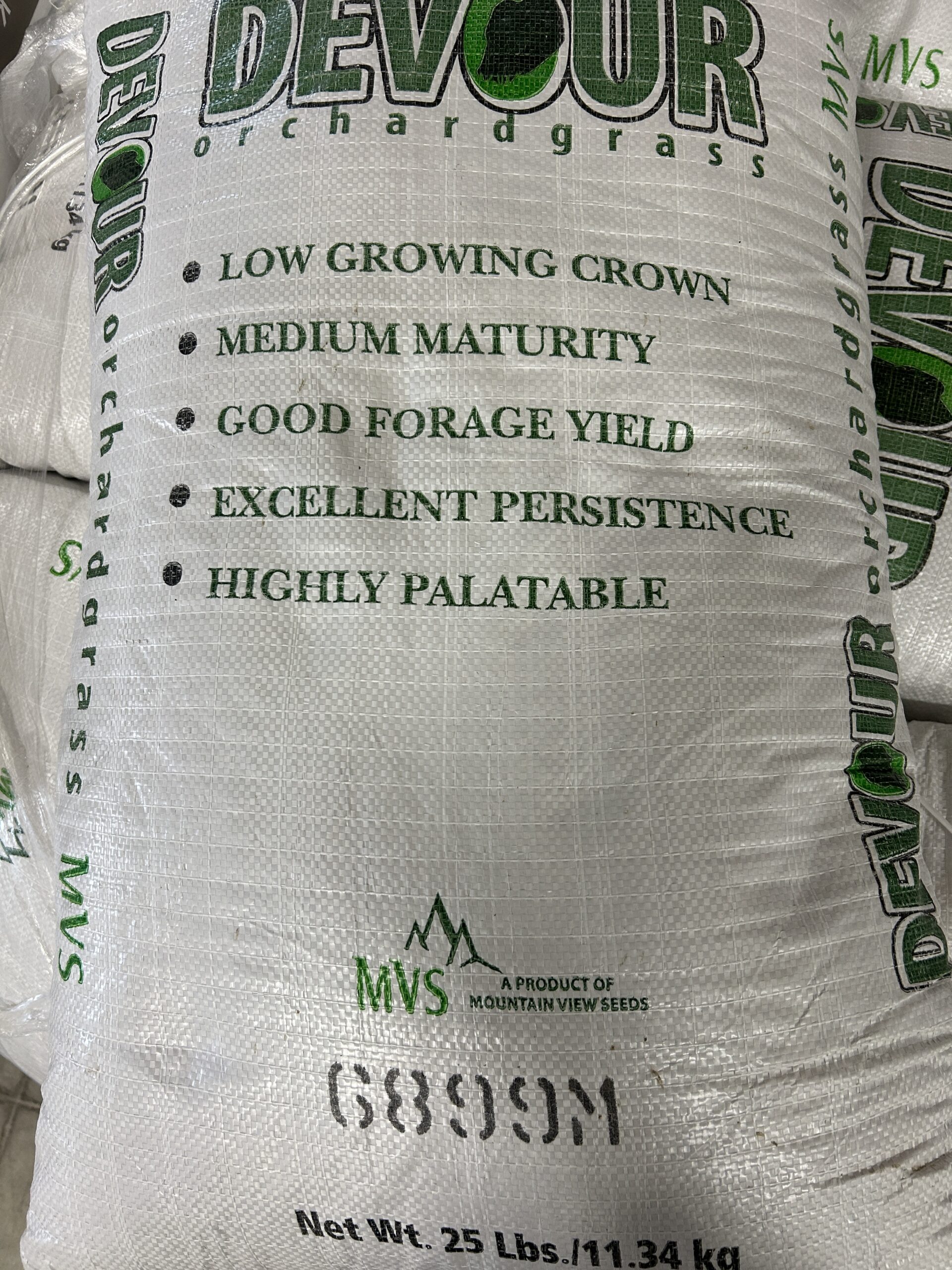We carry Orchardgrass seed, it is a later maturity type that works well with alfalfa. 25lb bags/or by the lb.